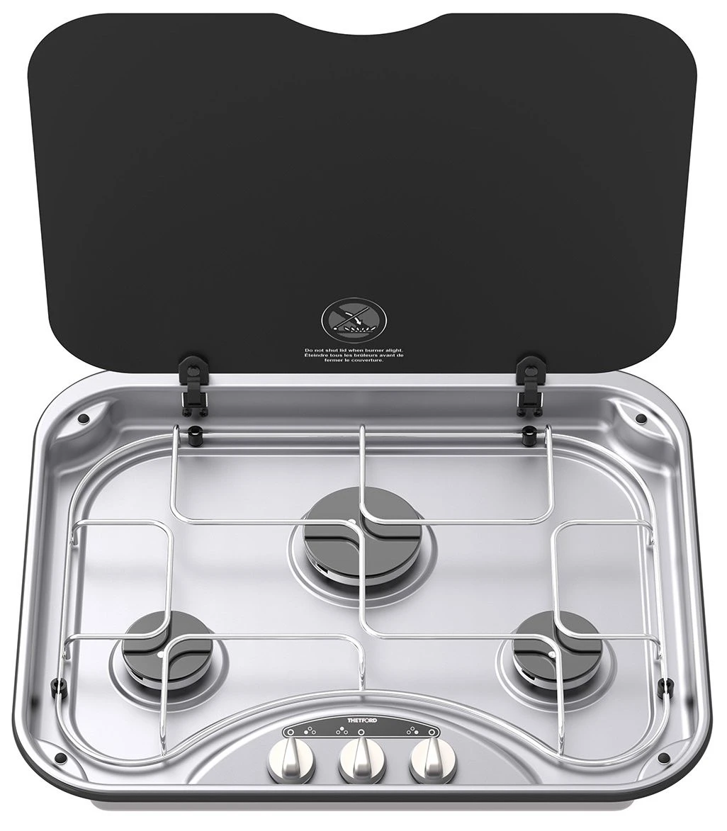 For convenience the Thetford 345 3-burner hob now has 12V ignition. The 345 has a glass lid to cover burners for a completely clean, contemporary finish, the Thetford 345 Rectangular Hob is constructed using high quality materials for complete endurance and durability.